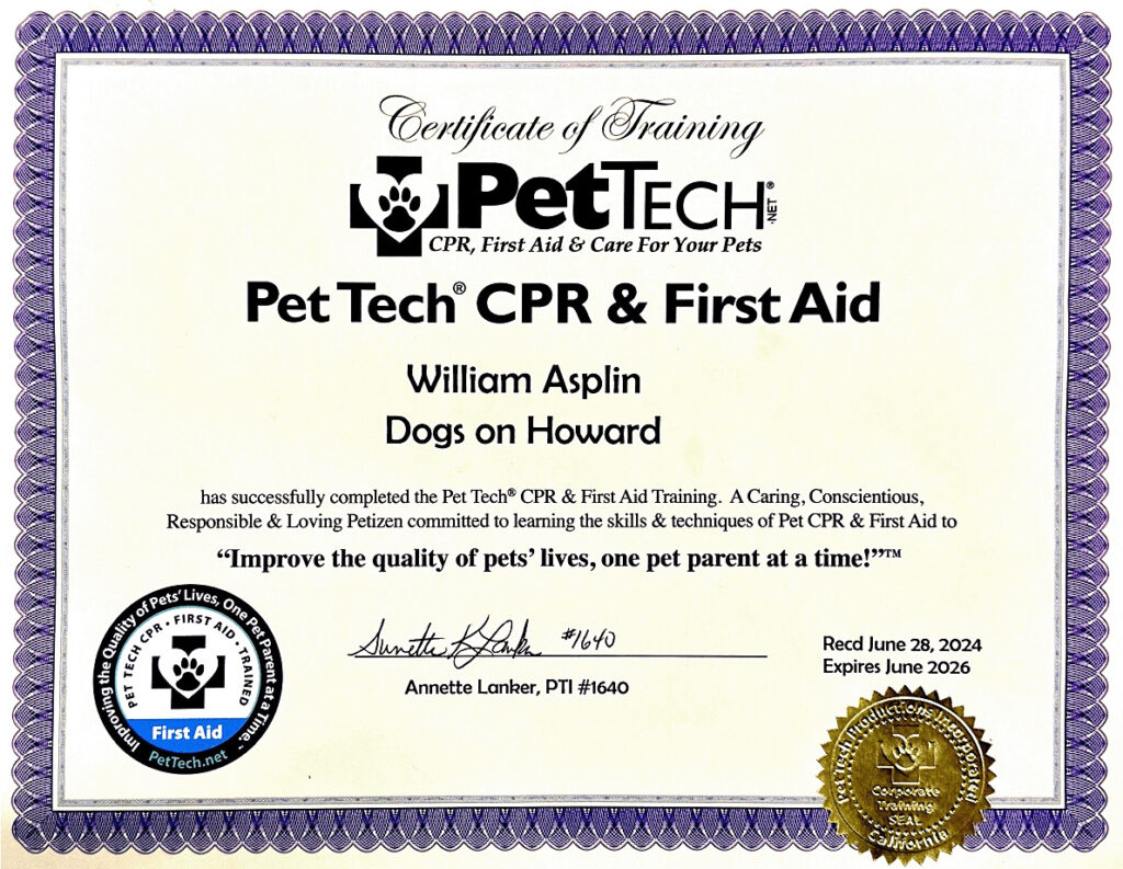 Dogs on Howard’s trainer, Bill Asplin, brings years of experience and expertise to our team. He is a certified IGP helper and holds certifications in canine first aid and CPR, ensuring your dog receives safe and professional care during training.